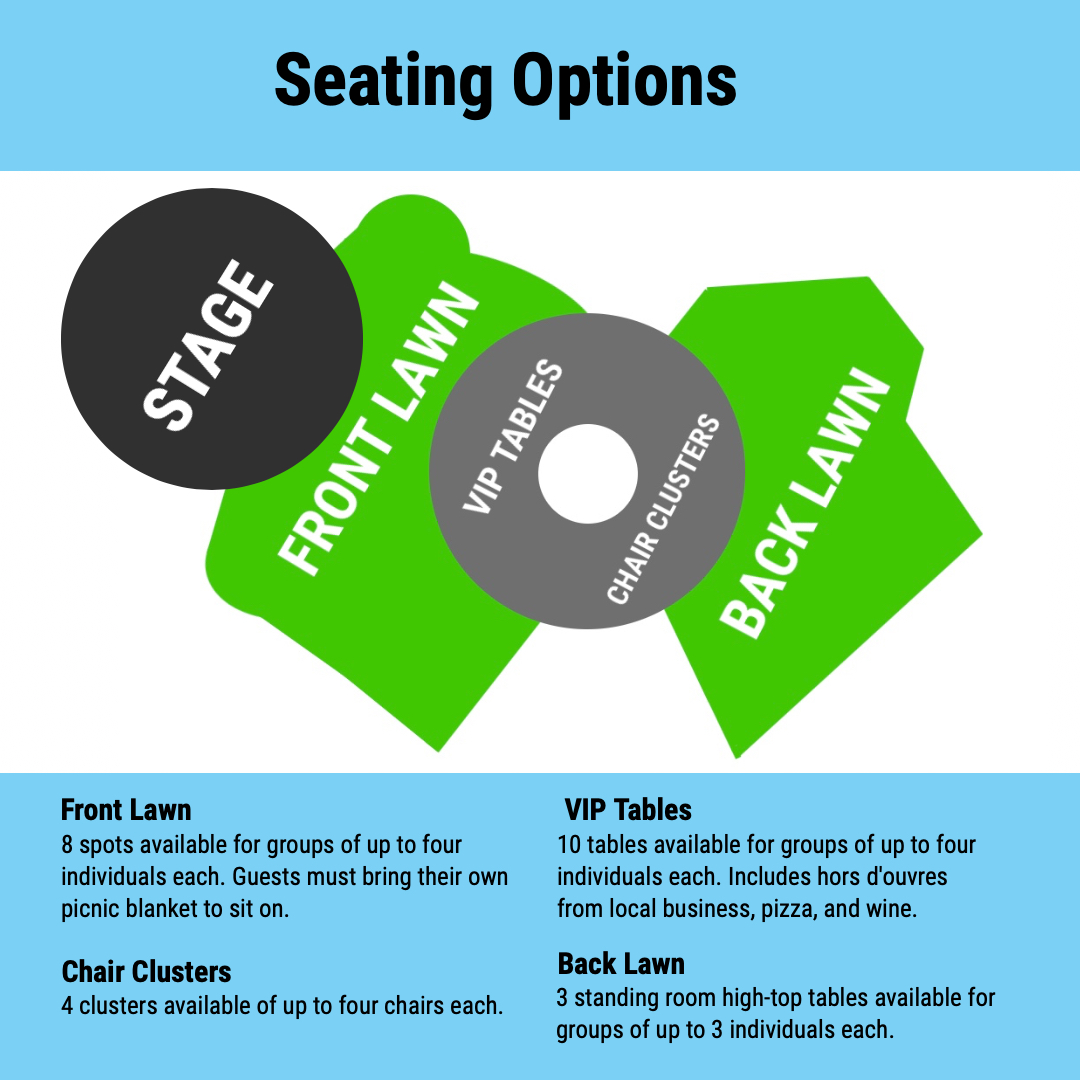 For the health and safety of yourself and others, all tickets will be sold by party. No individual tickets will be available. Each party (whether you select front lawn picnic blankets, VIP tables, chair clusters, or standing room high-top tables) will be assigned a socially distanced section. Tickets must be preordered and will not be available at the door.