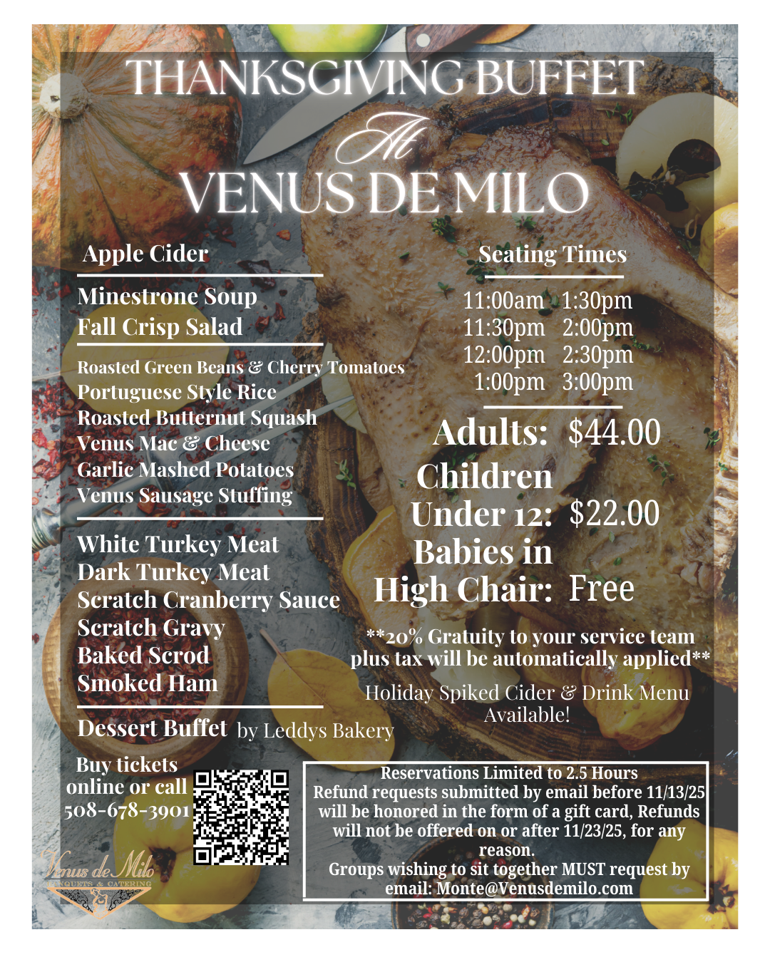 Refunds requested 14 or more days prior to the event will receive a full cash refund. Requests made 7 to 13 days before the event will be refunded in the form of a Venus de Milo gift card. Unfortunately, no refunds will be issued for cancellations made within 7 days of the event..