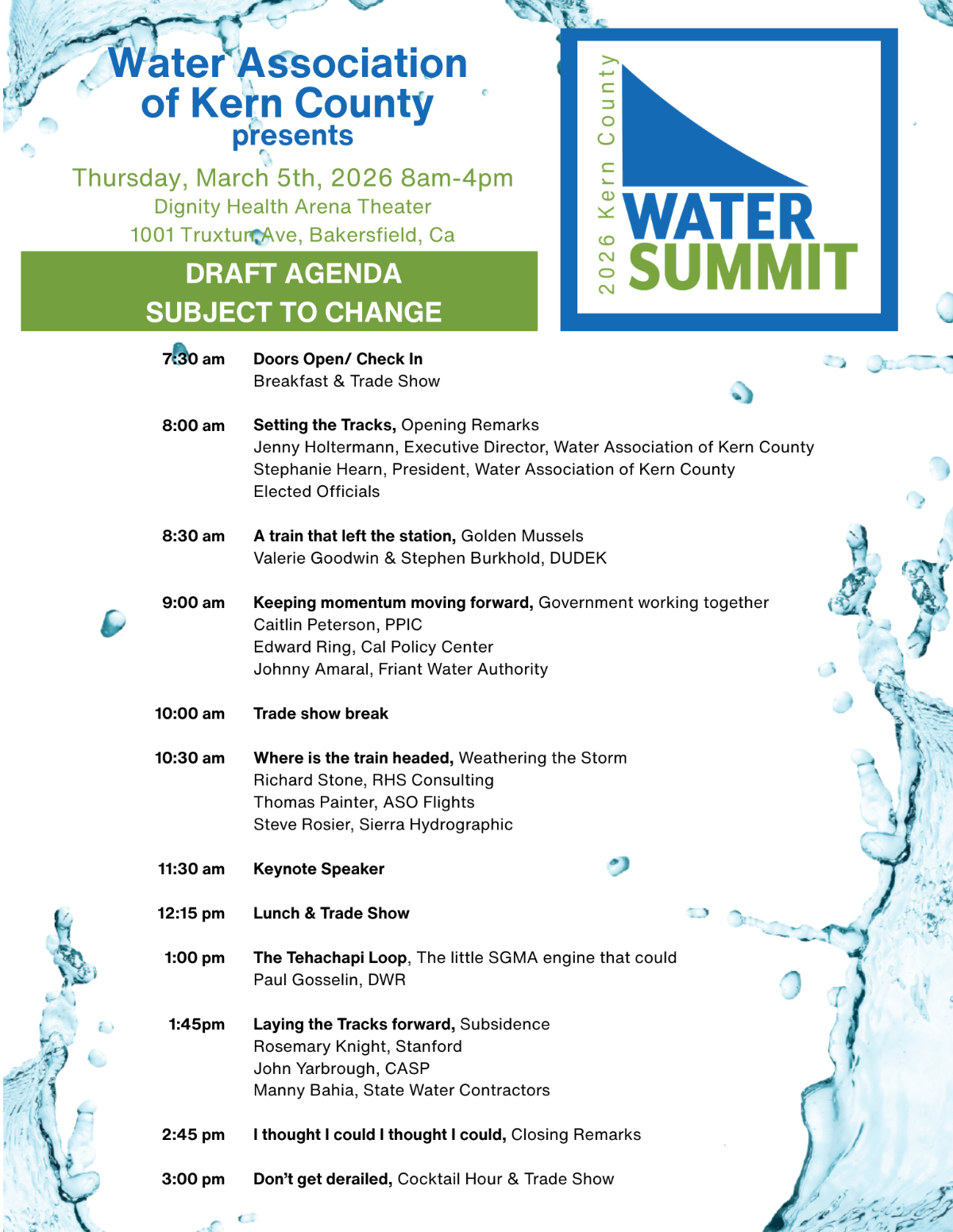 A full day of speakers and presenters discussing the top water issues and topics impacting Kern County & California.