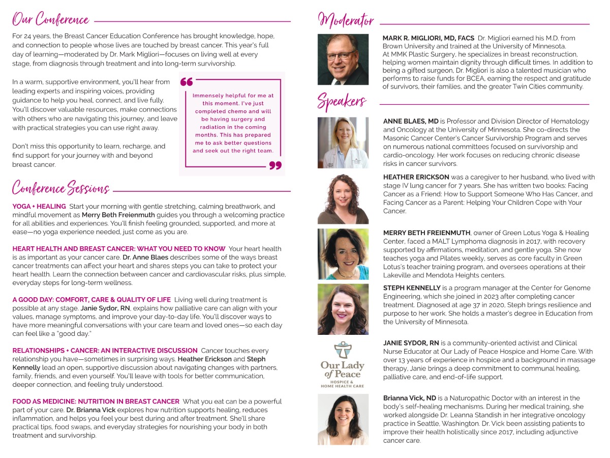 The ONLY conference of its kind in the Twin Cities, our annual Breast Cancer Education Conference features renowned experts and resources on the latest in breast cancer research, nutrition, care and prevention.