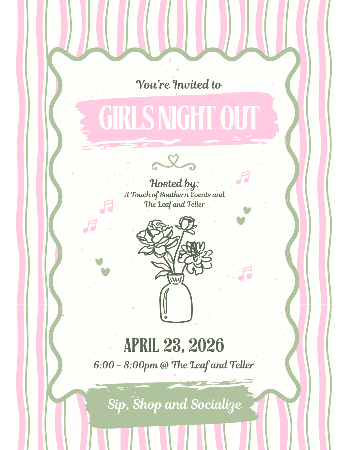The 3rd Annual "Girl's Night Out" on Thursday, April 23rd from 6:00-8:00pm at The Leaf and Teller. We invite you to sip, shop, and socialize with your besties to celebrate the spring season!