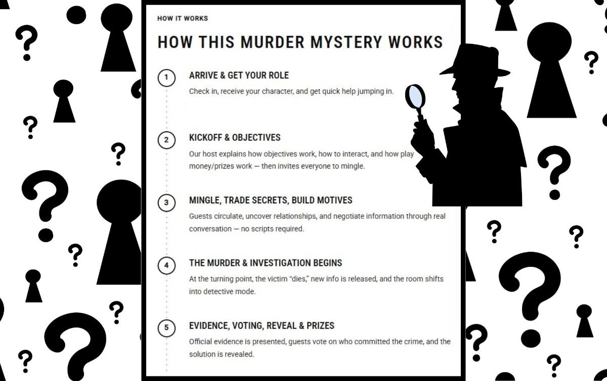 🎭 Costumes Encouraged 🗝️ Every Guest Plays a Role 🕵️♀️ Solve the Mystery Together