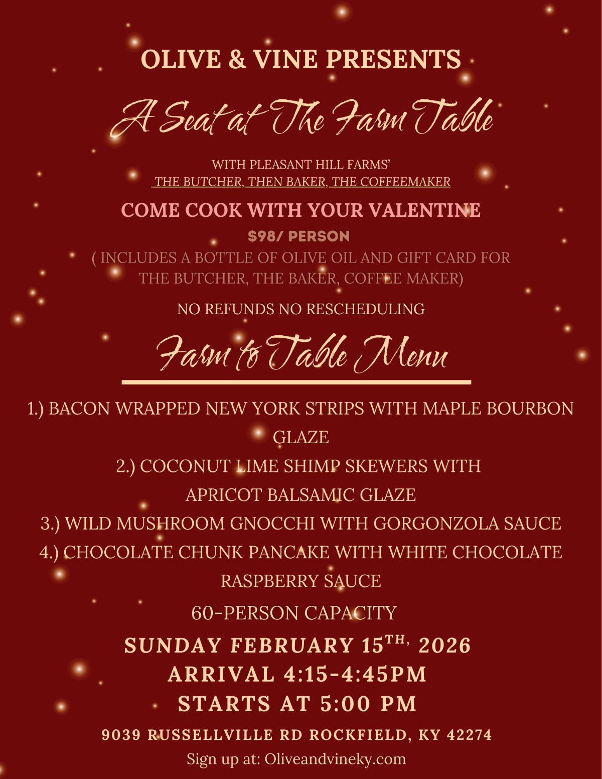 Join us for a festive evening of food, laughter, and hands-on cooking at Pleasant Hill Farm—just down the road from Olive & Vine. A Seat at the Farm Table celebrates the season with a cozy, farm-to-table cooking experience featuring four delicious courses: two meats, a seasonal vegetable, and a holiday-inspired dessert.