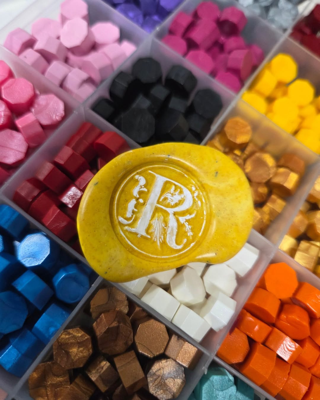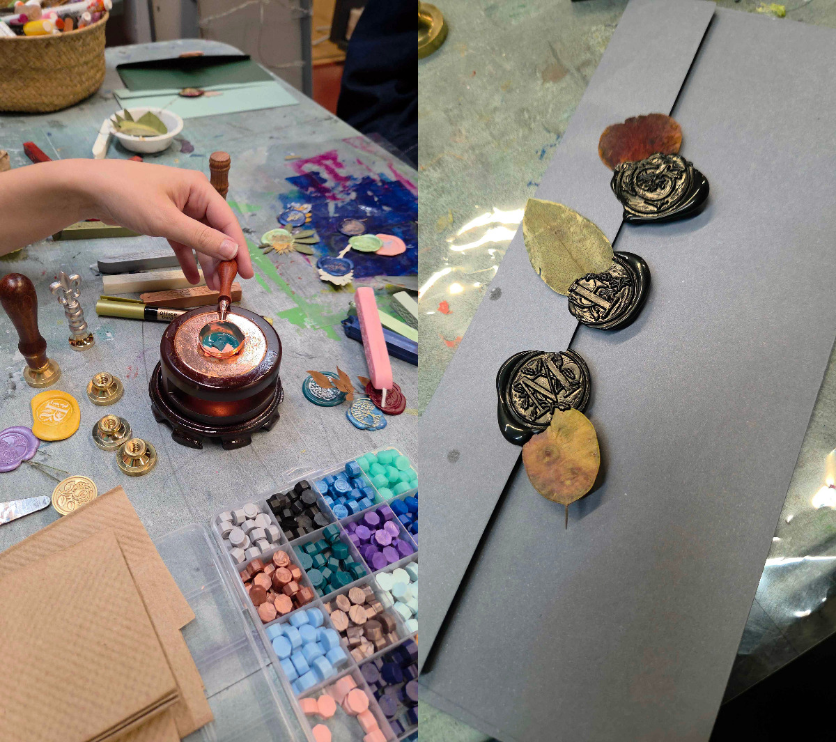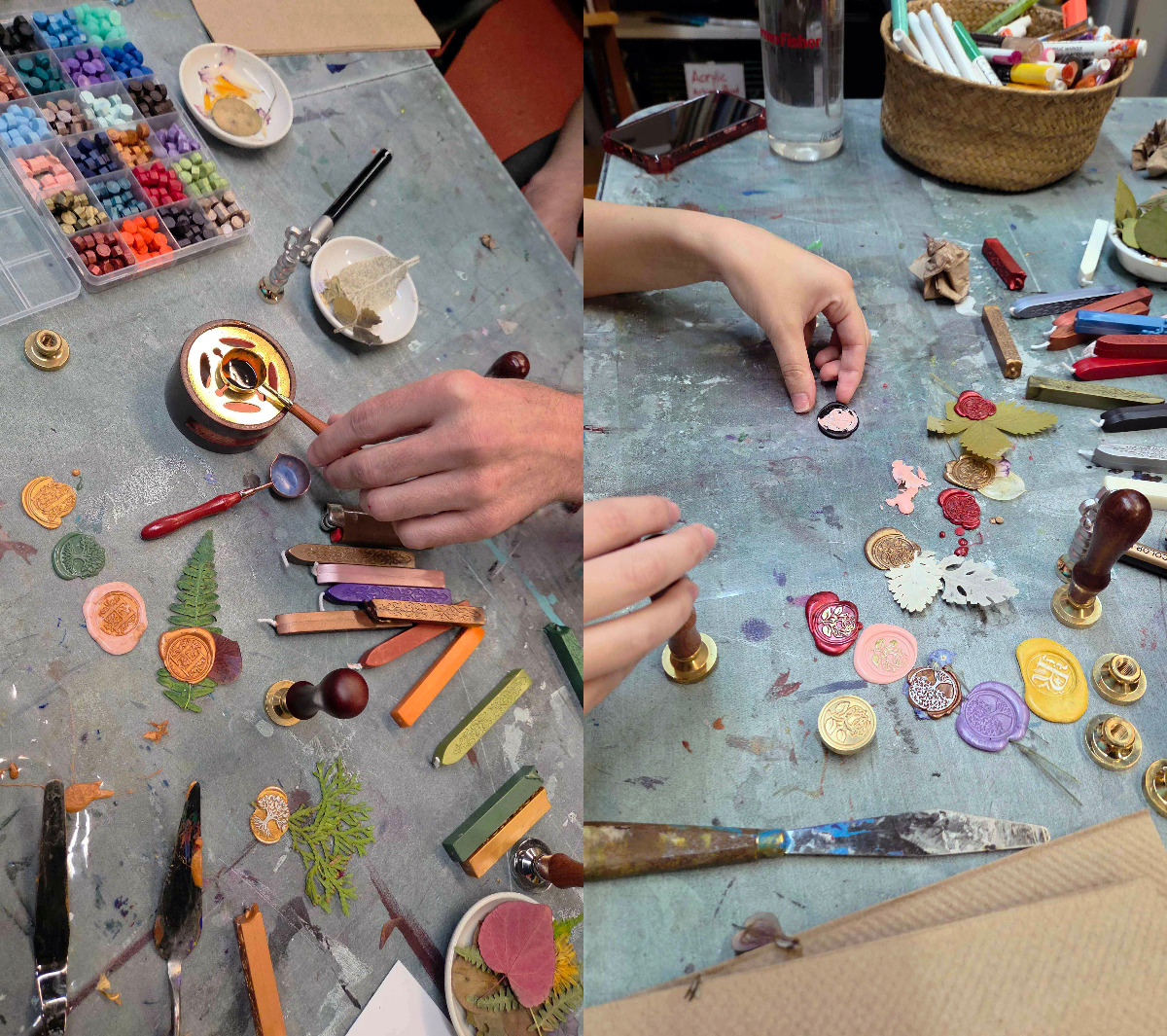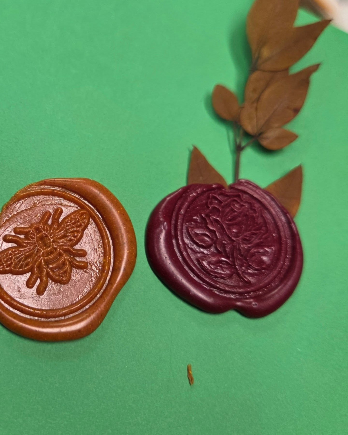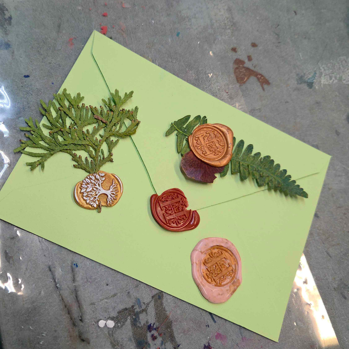 You will create at least 5 wax seals that you can either wax directly onto papers that you bring in, or take home with you and later glue onto whatever you like.