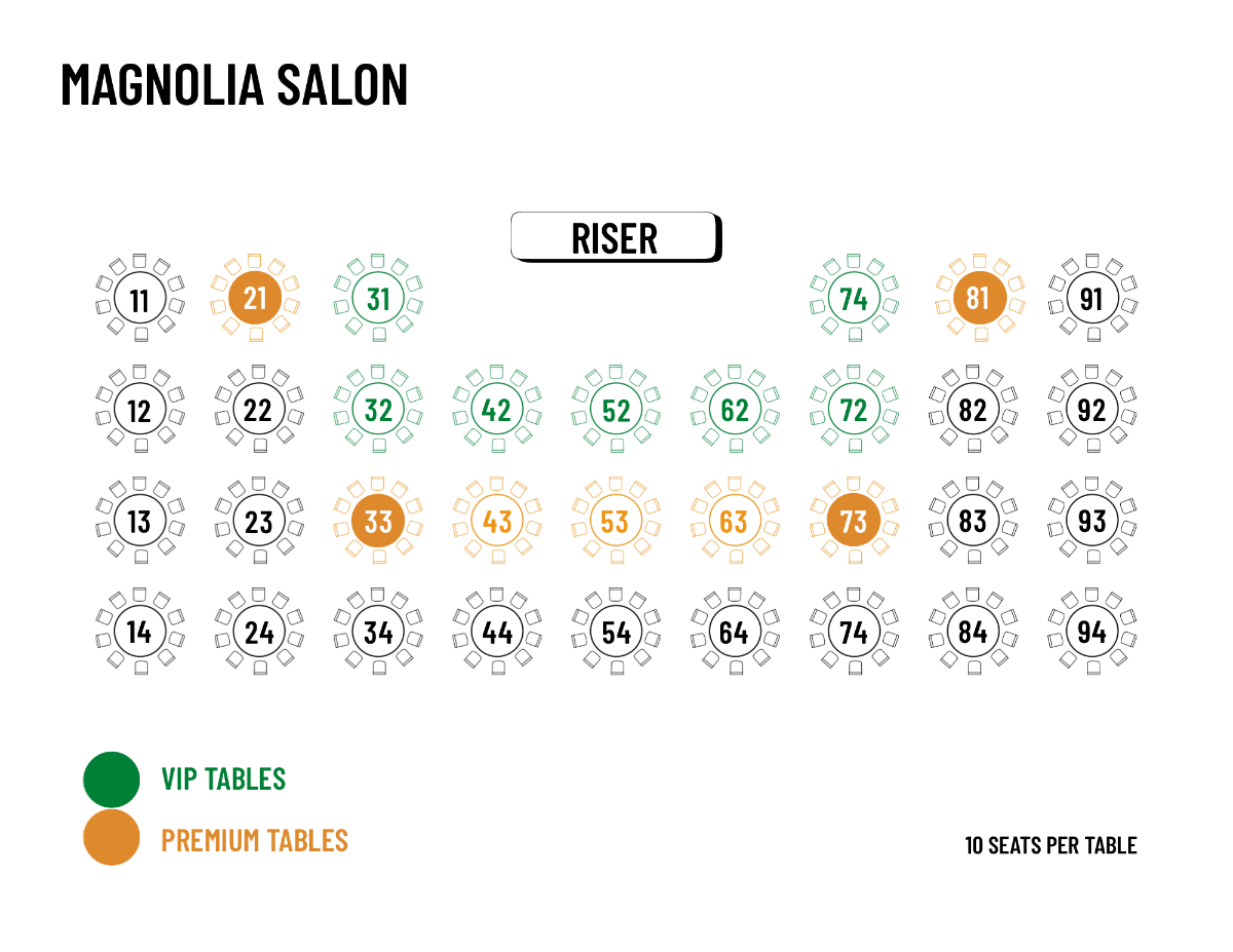 A full table of 10 seats may be reserved. VIP Reserved Tables (shown in green on the chart) are $1,250 per table, while Premium Tables (shown in orange on the chart) are $1,000 per table.