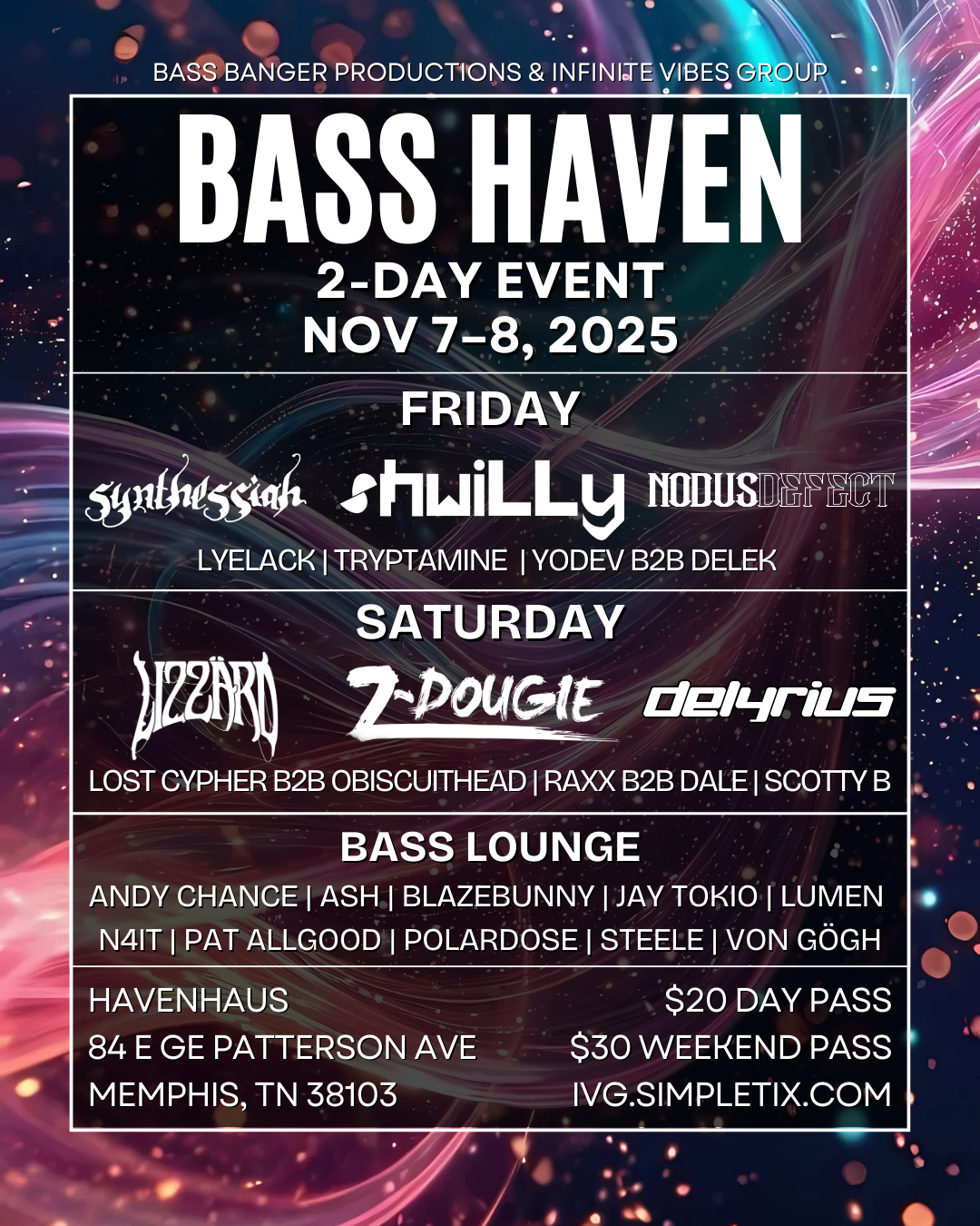 Bass Haven is a 2-day event happening November 7–8 at Havenhaus in Downtown Memphis, for fans of deep bass and nonstop energy.