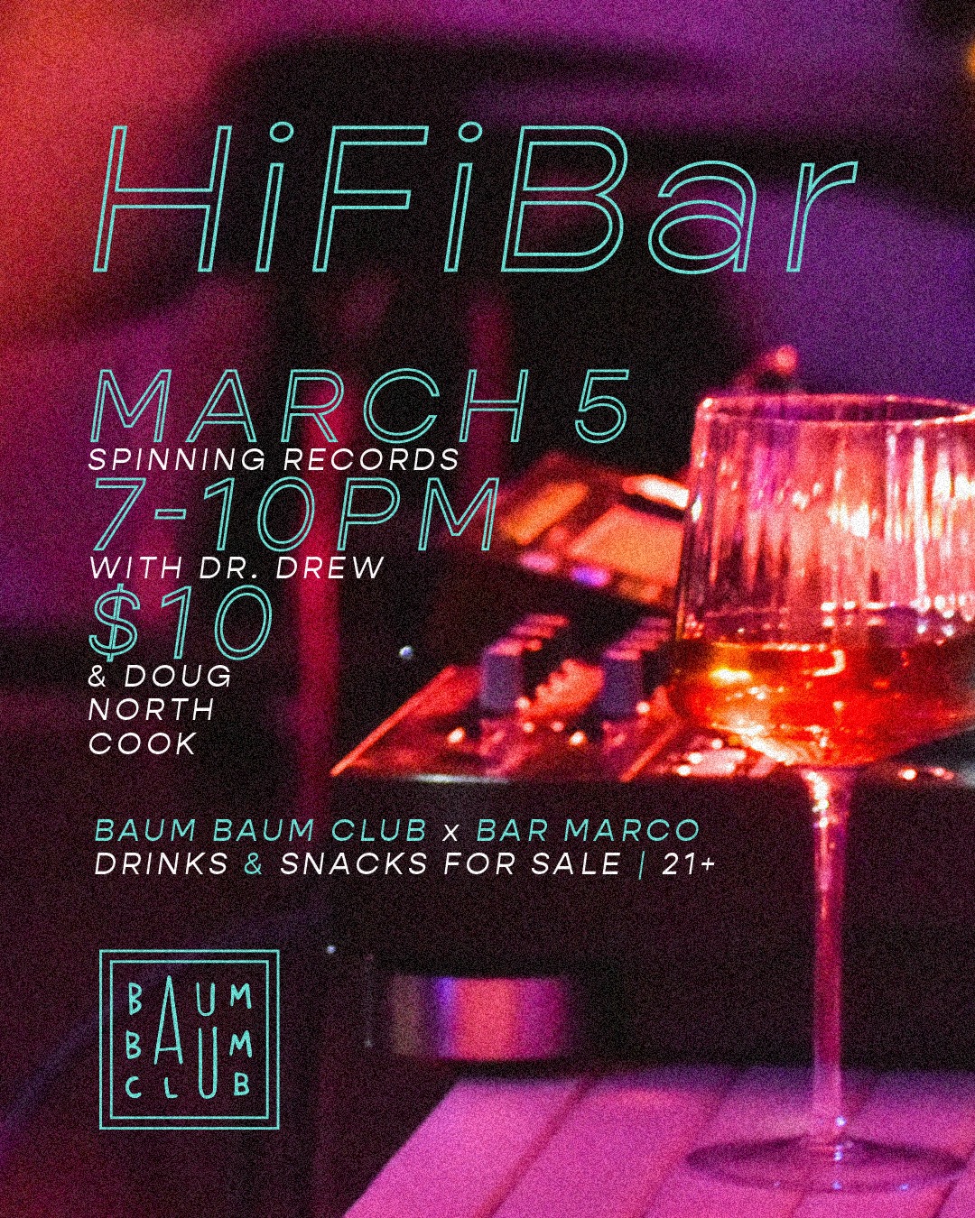 The Baum Baum Club HiFi Bar is a popup record listening lounge concept brought to you by Doug North Cook (cofounder of Baum Baum Club) and Andrew Heffner (manager of Bar Marco).