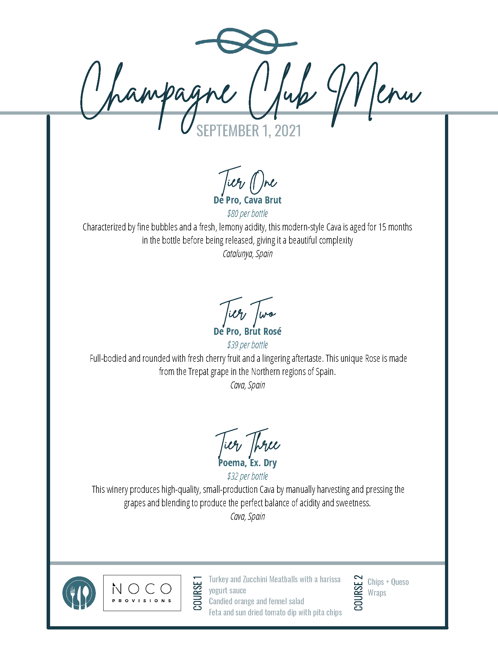 In addition to the Champagne tasting, the following delicious eats will be provided by our friends at Noco Provisions