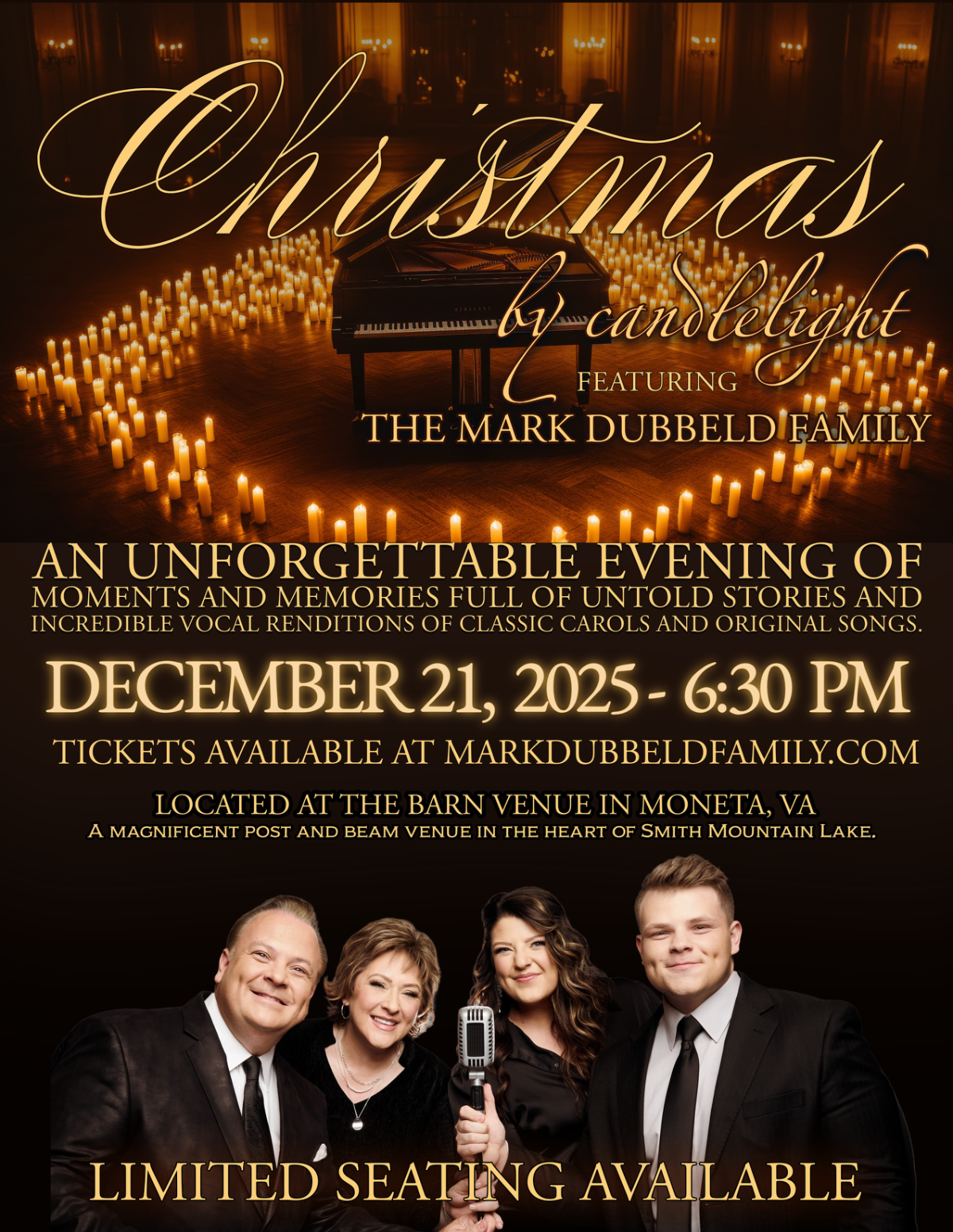 The Mark Dubbeld Family bring this never before Yuletide Celebration to The Barn Venue in Moneta, VA…a magnificent post and beam barn nestled in the heart of the Smith Mountain Lake community!