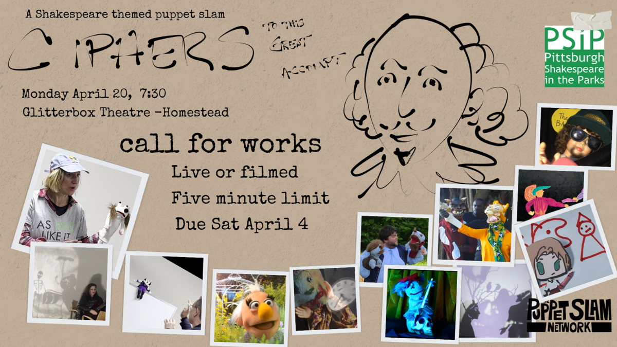 Join us for an evening of live, filmed, or possibly live-via-Zoom short puppet works (3–5 minutes) inspired by Shakespeare: sincere or outrageous, mashup or monologue, pun-filled or poignant. Presented as part of Pittsburgh Shakespeare in the Parks Week of Will Birthday celebration.