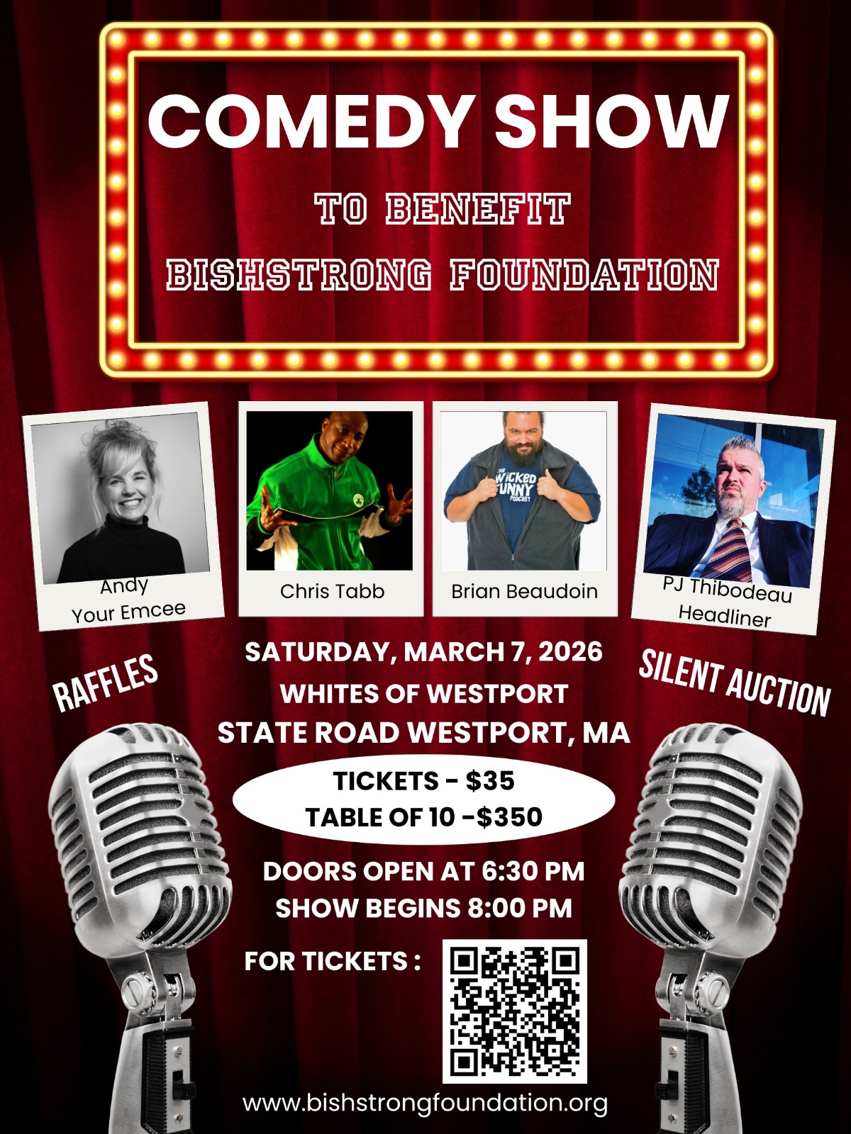 Get ready for a night of laughter and entertainment at our Comedy Show Fundraiser featuring four talented comedians! Join us for an evening filled with hilarious performances, exciting raffles, and a silent auction. Doors open at 6:30 pm, and the show kicks off at 8:00 pm. Best of all, every penny raised will go towards supporting the Bishstrong Foundation, making this event not only entertaining but also a meaningful way to give back to the community. Don't miss out on this unforgettable night of fun for a great cause!