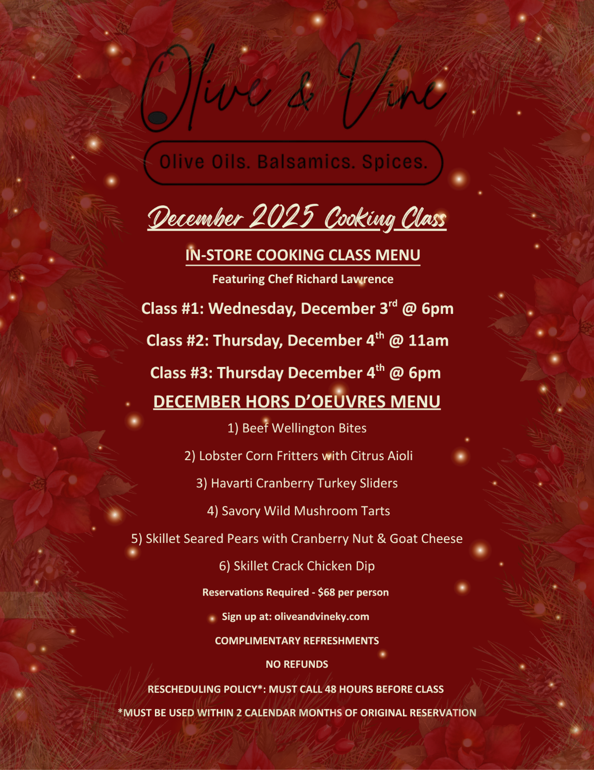 For our December Cooking Classes, we do things a little differently that out normal classes. Instead of making 4 courses, we are making all hors d' oeuvres!! we will make 4-5 different appetizers in our December cooking classes That way you can use them for you Christmas and holiday parties coming up!