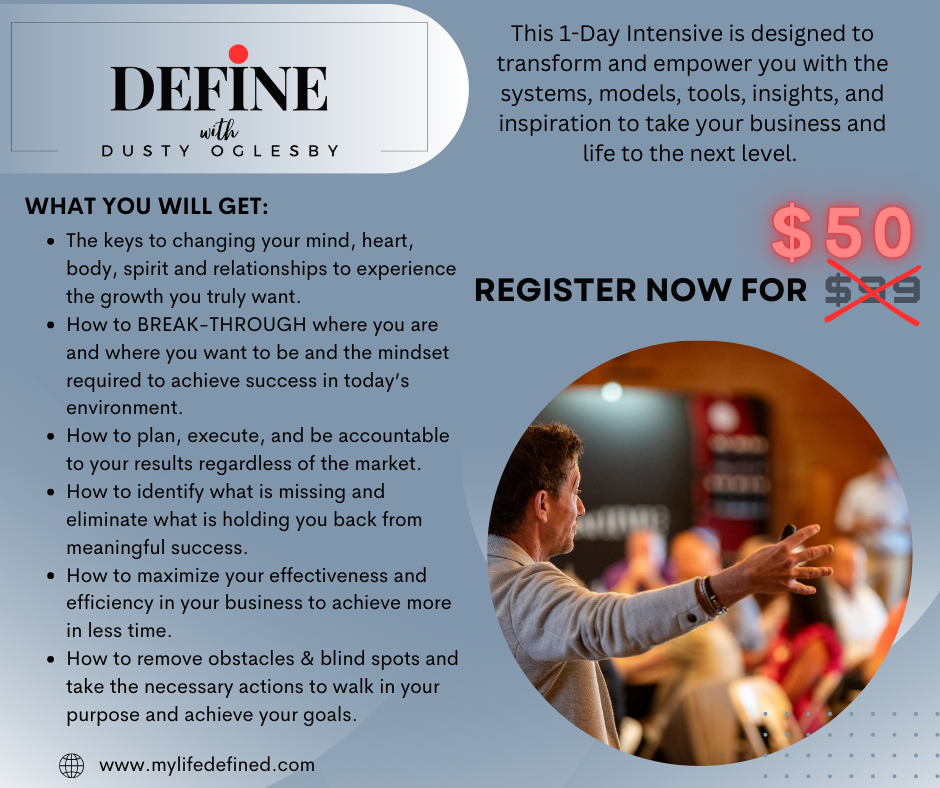 This 1-Day Intensive is designed to transform and empower you with the systems, models, tools, insights, and inspiration to take your business and life to the next level. You will DEFINE your WHY, along with defining your WHAT, which includes the mindset, skillset, and DEFINED actions to take right now in today’s market. The market does not DEFINE your success. YOU DO