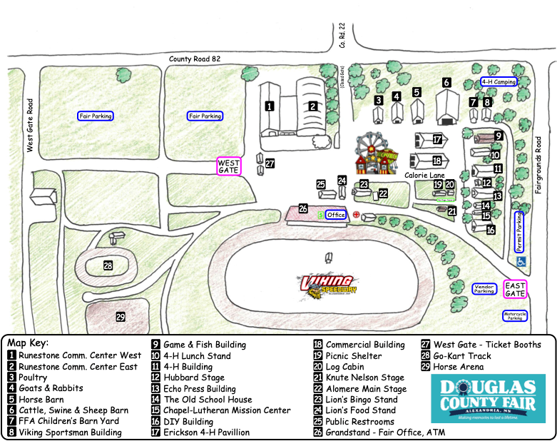 Join the Douglas County Historical Society for an educational, historic walking tour at the Douglas County Fair! Tours will meet at and leave from the log cabin building on the east side of the fairgrounds in Kathryn LeBrasseur Heritage Square (DCHS' Douglas County Fair Museum, #20 on map below) and last approximately 30 minutes, guided by one of our staff members. Donations are encouraged but not required. (Note: You must still purchase Fair admission to attend!)