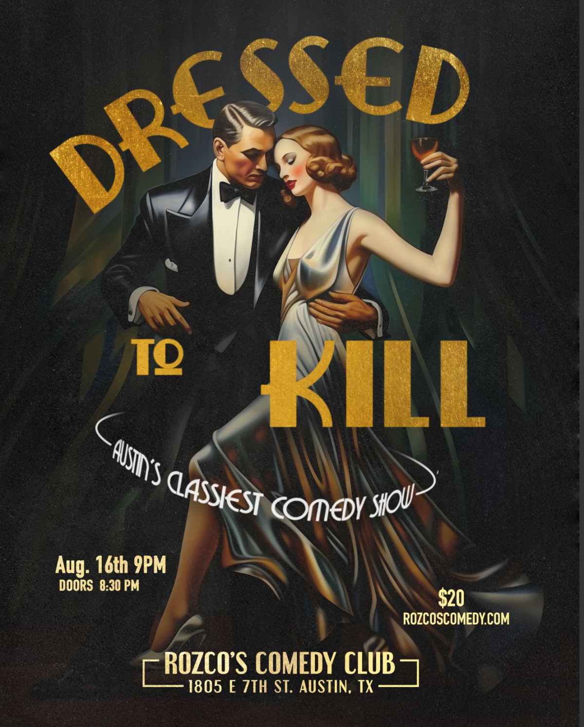 Grab your favorite sport coat and heels for Austin’s classiest comedy night, Dressed to Kill. The show is a throwback to the era of strong drinks, smoky lounges, and lewd humor. Expect your favorite comics in town dressed to the nines - guys in suits, gals in cocktail dresses, guys in cocktail dresses, gals in suits; whatever we’re not here to judge how someone gets fancy. We just tell em’ to bring their good shoes.