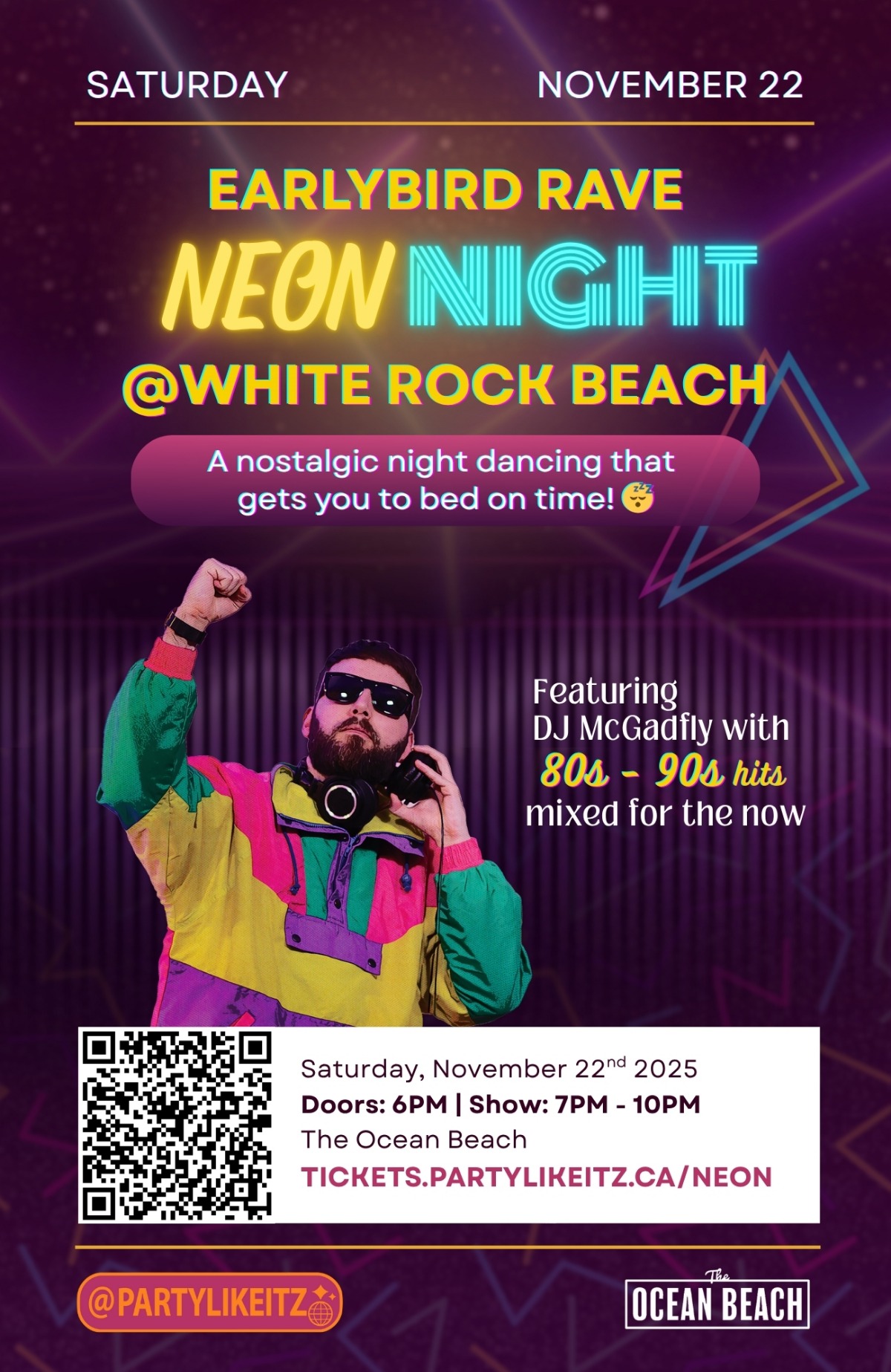 Step into a neon-soaked evening made for busy suburbanites who want to hit the dance floor then get to bed on time. The Earlybird Neon Night at White Rock Beach blends sunset vibes with high-energy 80s and 90s favourites, served up by nostalgia curator DJ McGadfly.