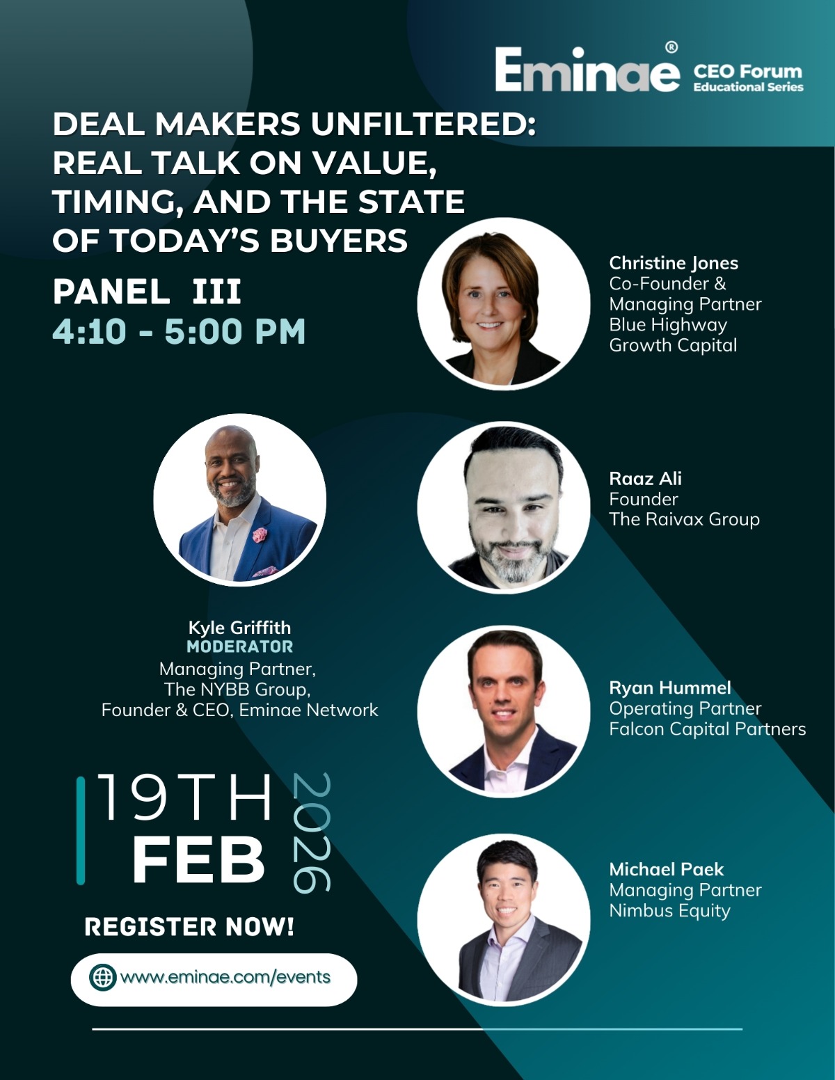 At the core of the Eminae Network’s mission is our dedication to empowering leaders with the tools and knowledge needed to navigate the complexities of deal-making. Through dynamic panel discussions and thought-provoking presentations, attendees will gain strategic insights to drive success and maximize opportunities in today’s competitive M&A landscape.