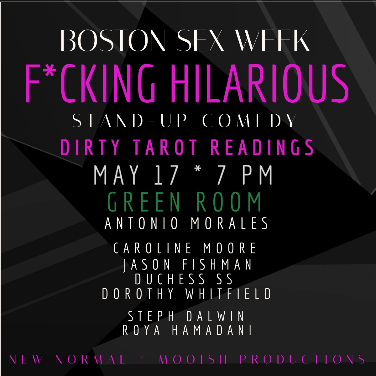 F*cking Hilarious, part of Sex Week Boston, is a showcase of sex-positive comedy. The show features historically underrepresented comedians talking about their experiences with sex, and closes out with slutty tarot readings.