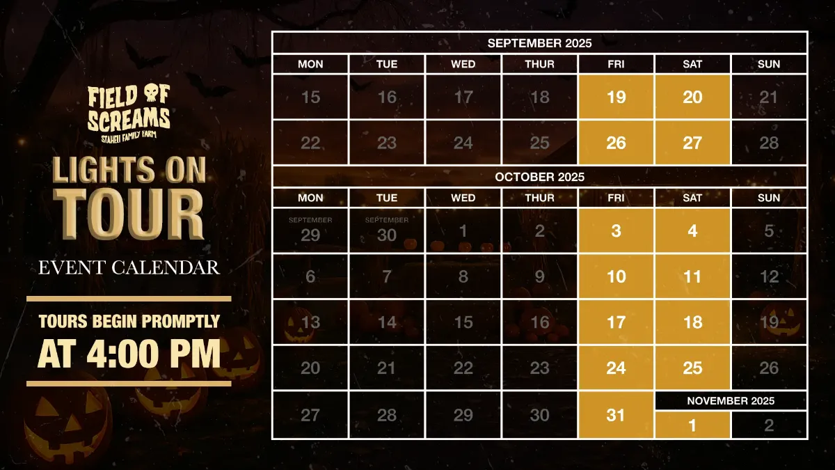 WARNING: The Field of Screams Lights on Tour and Staheli Family Farm in general, will have areas of low lighting and uneven ground. Guests with respiratory sensitivities, a history of seizures or epilepsy are advised not to participate. If you suspect your health could be at risk for any reason, or you could aggravate a pre-existing condition of any kind, DO NOT PARTICIPATE!