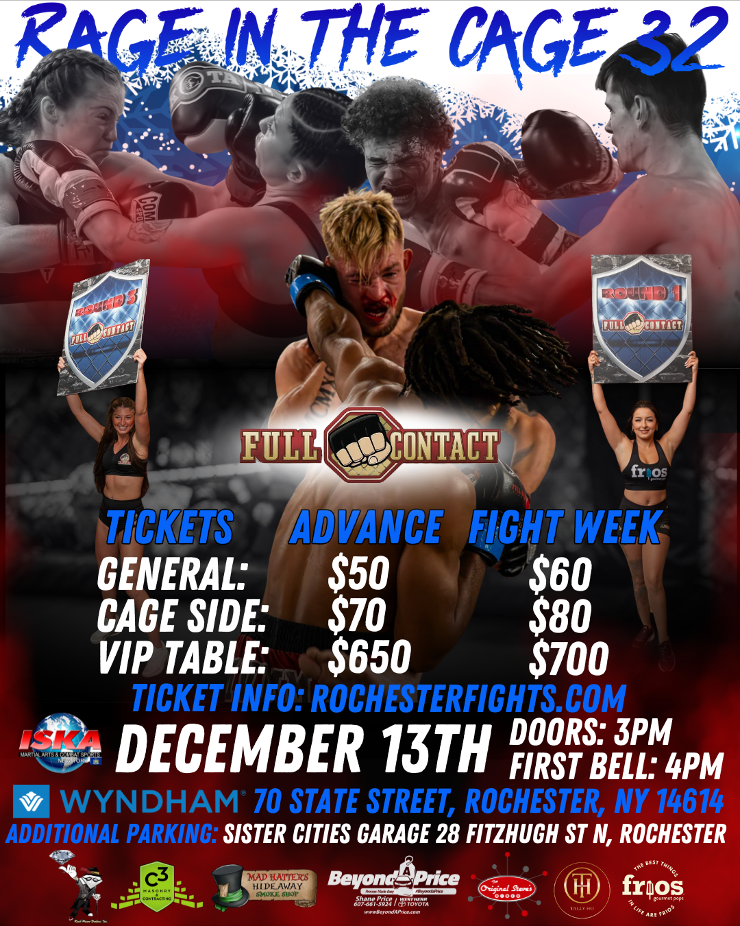 Full Contact Promotions is NYs premiere amateur MMA Kickboxing organization. Full Contact Promotions is a proving ground for amateur fighters that provide an outlet for "up and comers!" We welcome all to become part of not only the fastest growing organization in the business, but to also be a competitor in the fastest growing sport in the world! We constantly look to expand our list of talented fighters - Full contact promotions is honored to host an event that can display such talent. Rage in the Cage 32 will host 15-20 action pack MMA and Kickboxing fights inside a MMA Cage.