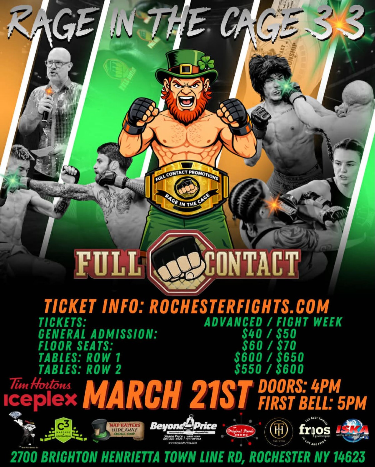 Full Contact Promotions is NYs premiere amateur MMA Kickboxing organization. Full Contact Promotions is a proving ground for amateur fighters that provide an outlet for "up and comers!" We welcome all to become part of not only the fastest growing organization in the business, but to also be a competitor in the fastest growing sport in the world! We constantly look to expand our list of talented fighters - Full contact promotions is honored to host an event that can display such talent. Rage in the Cage 33 will host 15-20 action pack MMA and Kickboxing fights inside a MMA Cage.