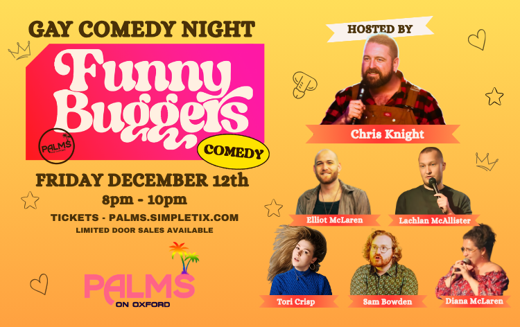 Palms On Oxford proudly hosts it's next monthly Gay comedy night Funny Buggers @ Palms on Friday 12th of December @ 8.00pm
