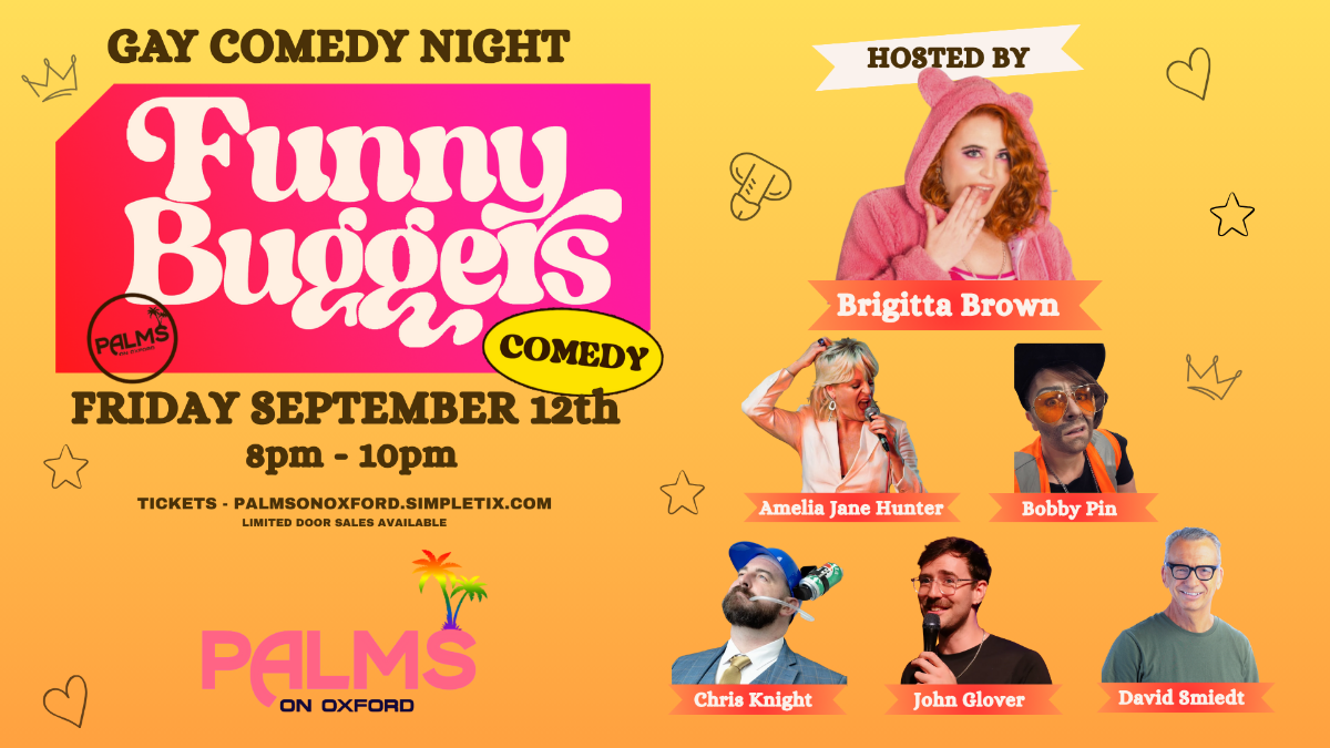 Palms On Oxford proudly hosts it's next monthly Gay comedy night Funny Buggers @ Palms on Friday 12th of September @ 8.00pm
