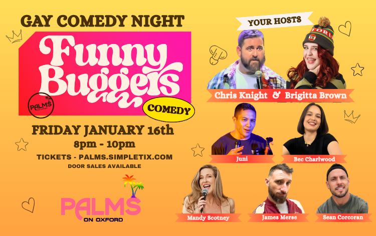 Palms On Oxford proudly hosts it's next monthly Gay comedy night - Funny Buggers @ Palms on Friday 16th of January @ 8.00pm.