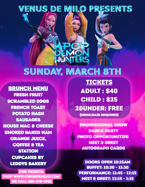 Join us for an unforgettable brunch with the K-pop Demon Hunters! Step into a world where your favorite idols double as fierce fighters against the forces of darkness. This exclusive event includes a special meet and greet, giving fans the rare chance to chat, snap selfies, and get up close with the squad who slay both stages and demons. Whether you’re here for the sweet treats or the spicy stories from their latest supernatural missions, this brunch promises killer vibes, legendary moments, and a live performance. Get ready to slay your Sunday!