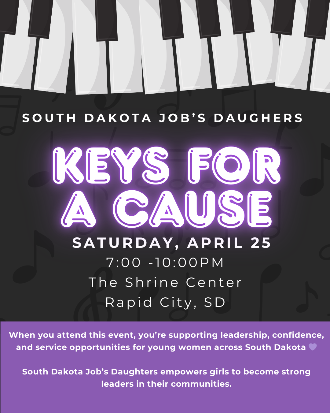 Join South Dakota Job’s Daughters for a high-energy Dueling Piano Fundraiser on April 25 in Rapid City! 🎶 Live music by Just Duet 🕖 7–10 PM 🍴 Light appetizers 🍸 Cash bar