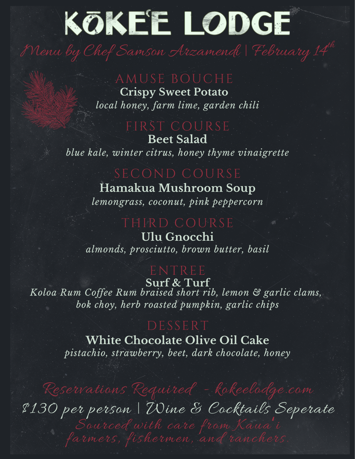 RThe Kōkeʻe Lodge curates a new menu every month inspired by Hawaiʻi grown ingredients.