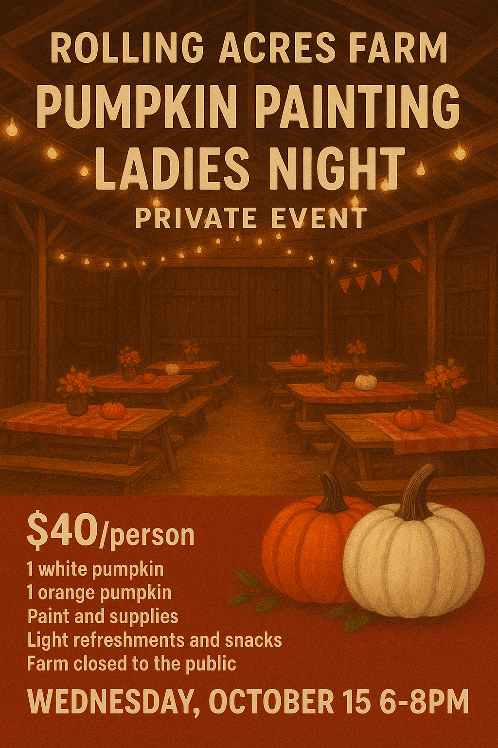 Looking for a fun night out with the girls? Come to Rolling Acres Farm for pumpkin painting, an evening stroll through the corn maze, and all the Fall vibes! This will be a fun night for sure. Your ticked includes: