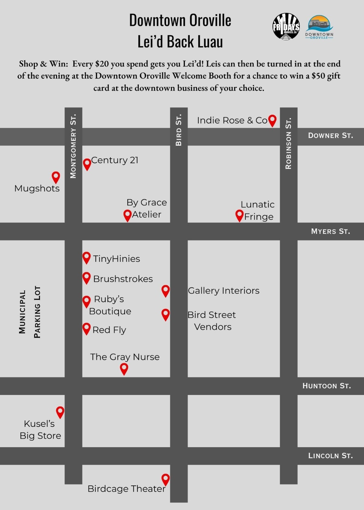 Shop & Win. Every $20 you spend gets you Lei’d! Leis can then be turned in at the end of the evening at the Downtown Oroville Welcome Booth for a chance to win a $50 gift card at the downtown business of your choice. There are a limited number of tickets, so don’t wait, buy tickets today!