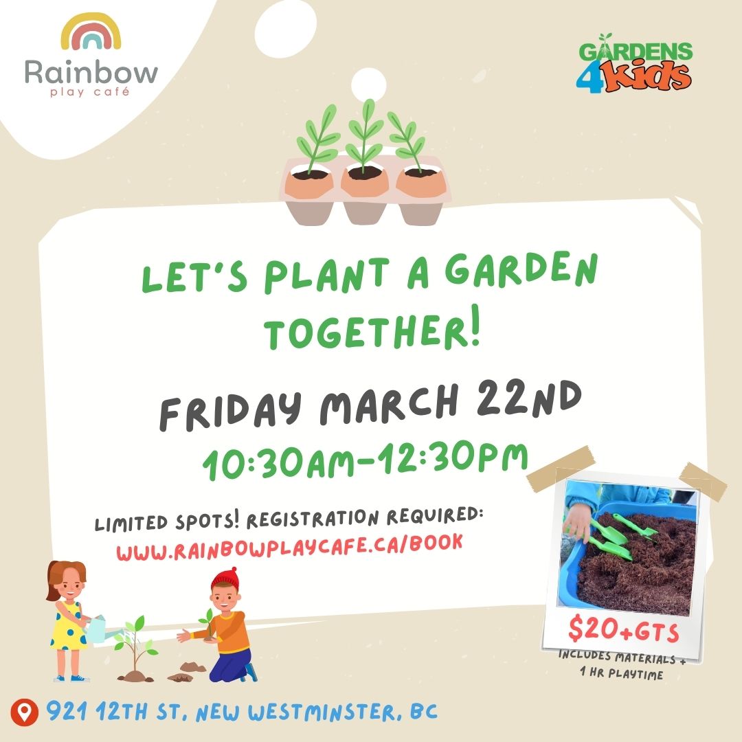 Join us in celebrating Spring and all things gardening with Gardens4Kids at Rainbow Play Cafe on Friday March 22nd from 10:30am to 12:30pm!