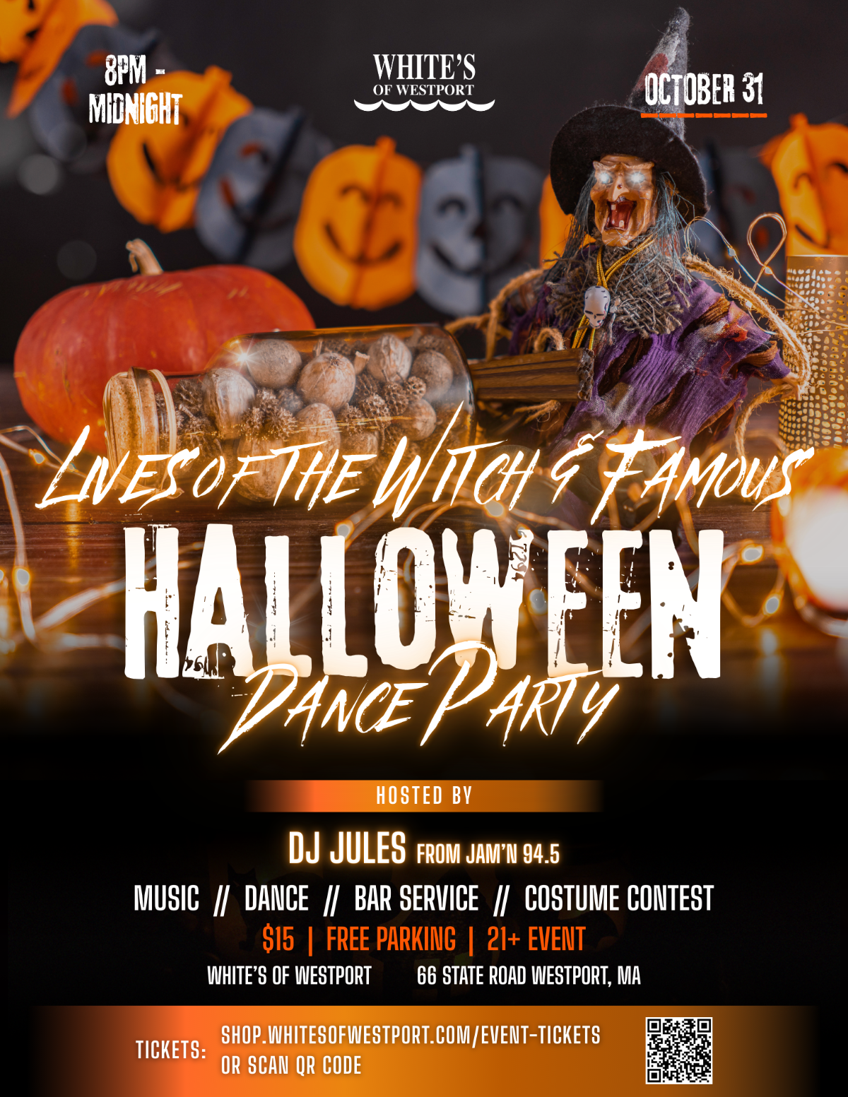 Get ready for a devilish night on Friday, October 31st at White’s of Westport! 🎃 The Lives of the Witch and Famous Halloween Dance Party kicks off at 8PM with nonstop music from DJ Jules of JAM’N 94.5 keeping the dance floor packed until midnight.