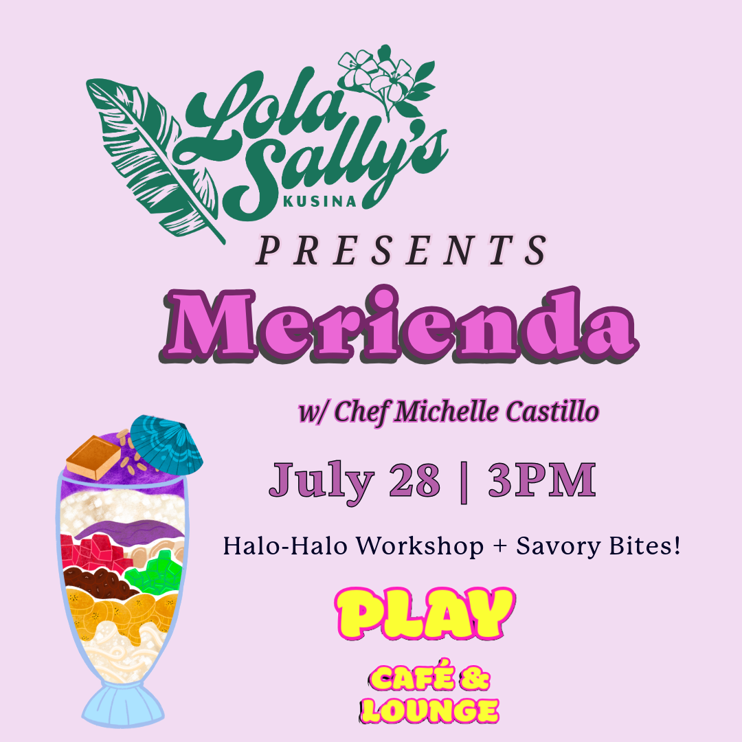 Join local chef-owner & artist Michelle Castillo of Lola Sally's Kusina for Merienda on Sunday, July 28th at 3 PM inside of Play Lounge & Cafe!