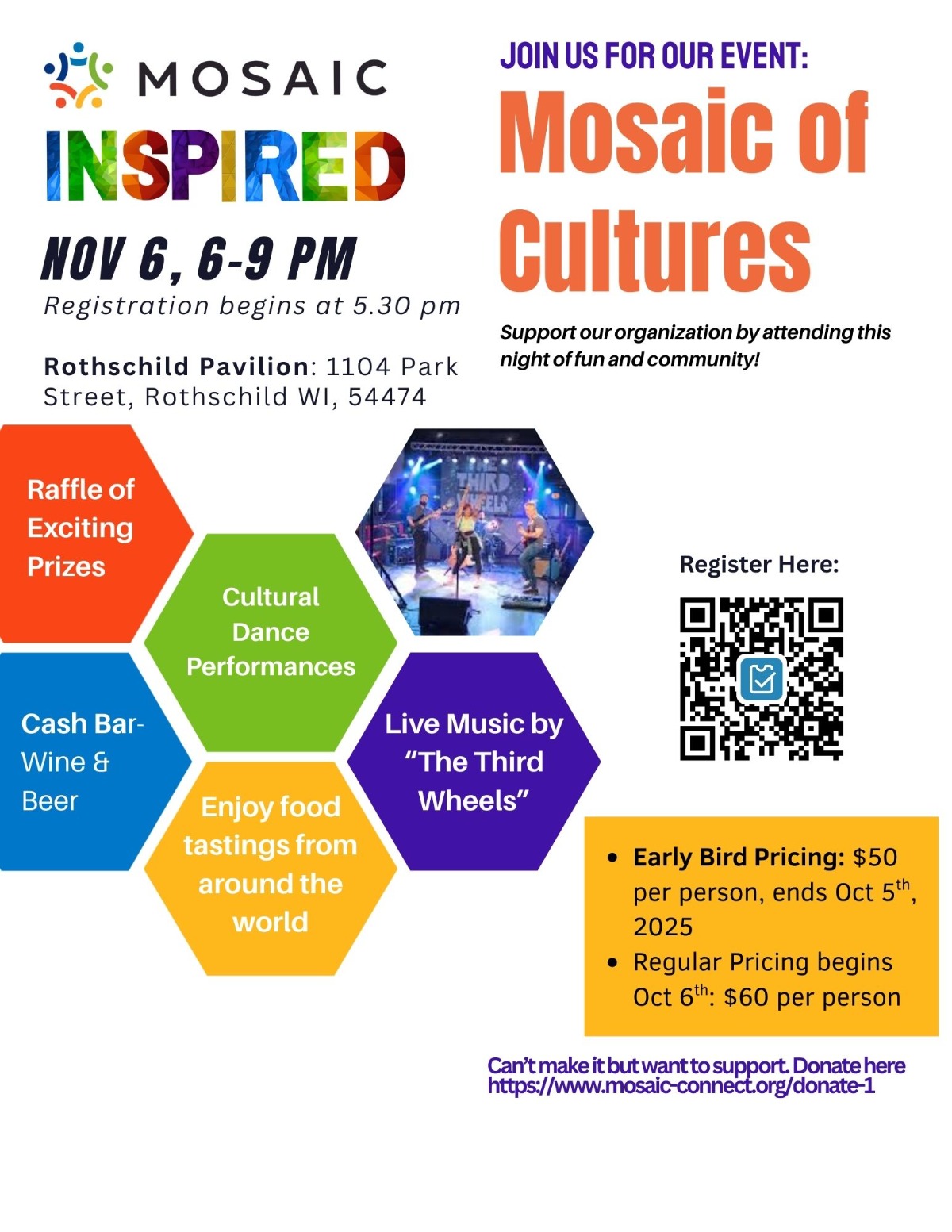 Join us for our Mosaic of Cultures Event on Thursday, November 6th at the Rothschild Pavilion from 6:00pm-9:00pm! Attending this event will help support the organization and mission of Mosaic of North Central Wisconsin.