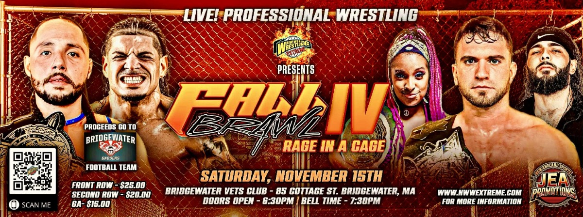 Join us at the Bridgewater Vets Club in Bridgewater, Massachusetts, for an unforgettable night where legends are made, and rivalries are settled. Whether you're a die-hard wrestling fan or new to the sport, Fall Brawl IV Rage in a Cage promises to deliver an evening of entertainment and excitement like no other.