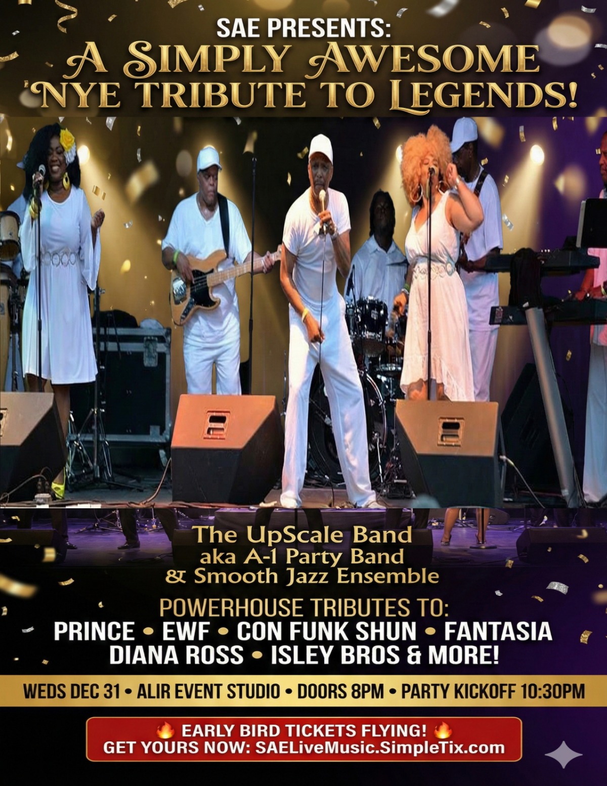 This year’s NYE Variety Showcase & Countdown is BIGGER than ever — and we’re doing it with the #1 Party Band & Smooth Jazz Ensemble on the Southside, The UpScale Band aka A-1 Party Band & Smooth Jazz Ensemble led by the incredible Mark Anthony Alexander!