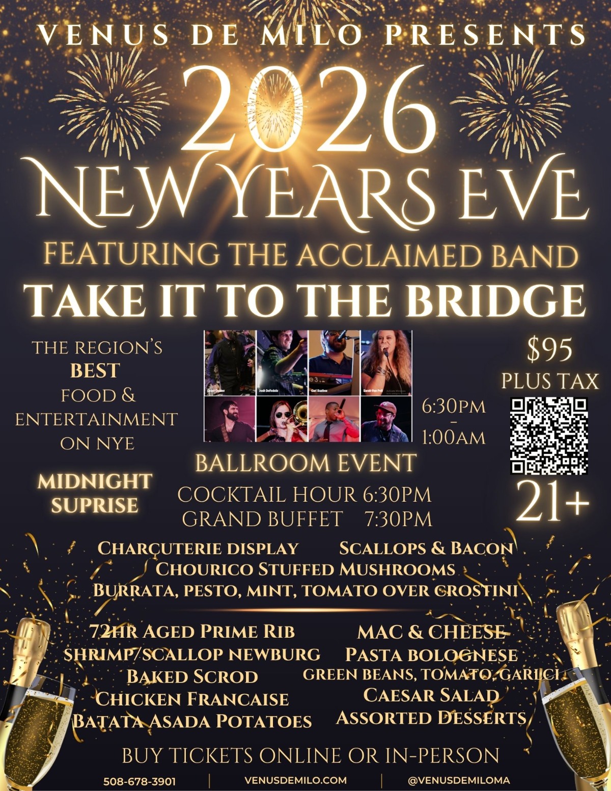 Welcome to the most elegant New Years Eve Party in New England!! Featuring one of the region's Top Bands, TAKE IT TO THE BRIDGE!!! Packed with our renowned cuisine, elegant surroundings, music, drinks, dancing and one AWESOME pre-midnight surprise ... This IS the party to bring in your New Year! All Menu details are on the image!