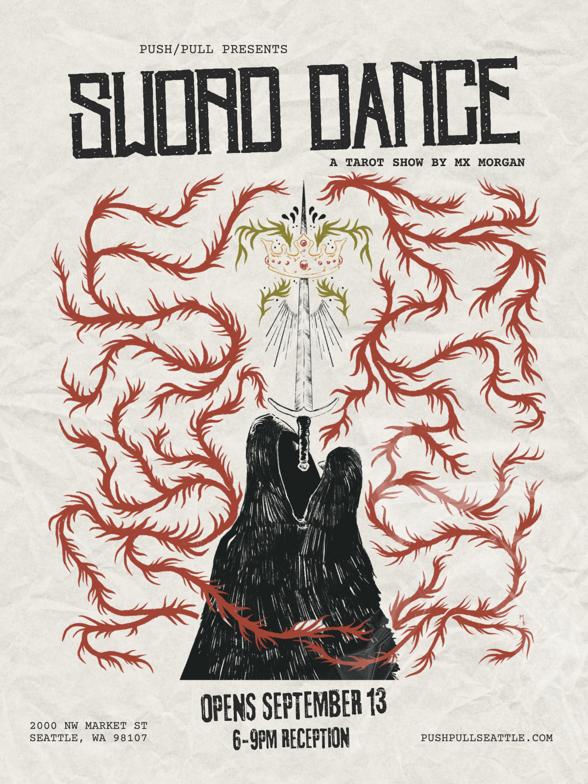 SWORD DANCE is a series by Seattle artist and illustrator Mx. Morgan, themed with wolves and the swords suit from traditional tarot, displayed in Risograph print. Particular to Mx. Morgan's body of work, the viewer is invited to intuitively find oneself in the feral animal— and like in tarot, one may discover inner truths.