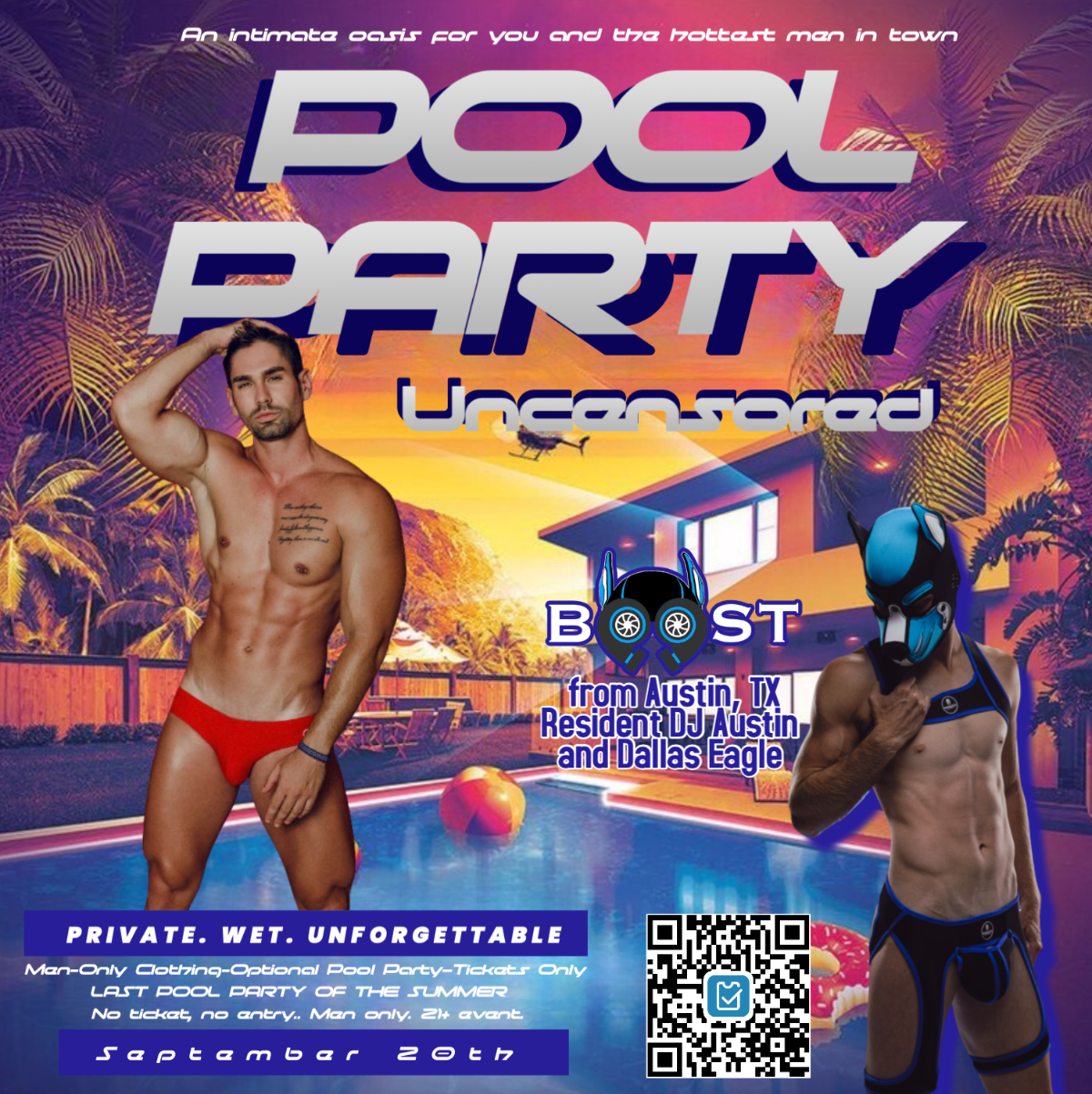 Dive into the most exclusive, seductive, and unforgettable pool party of the year. This man-only, clothing-optional event is your invitation to an intimate oasis filled with the hottest men in town, good vibes, and summer’s sexiest energy.