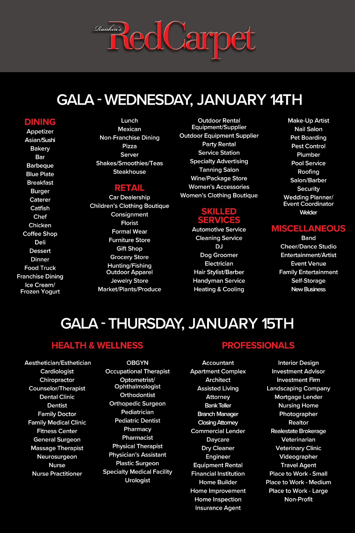 Red Carpet 2025/2026 is on track to be our best yet! The Top Five and Winner of each business category will be celebrated and announced ONLY on their category award night. Listed below are the business categories and their specific night of recognition. With thousands of nominations and votes, we say CONGRATULATIONS to all of our Top Five nominees and Winners being announced at the 2025/2026 Rankin's Best of the Best!