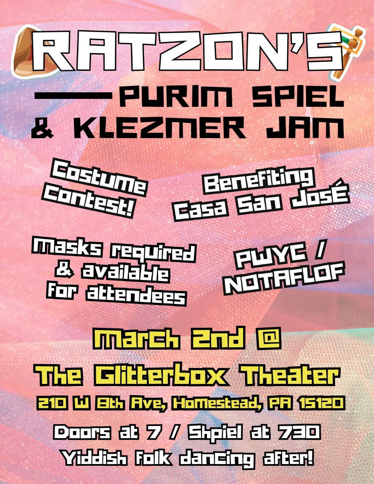 Regarding the holiday of Purim, G🎭D spake, “When things seem most bleak, write for each other a play satirizing the abuses of empire, and thus you shall not fall into despair! Best if you make it musical.” And thus we have! Your friends of Ratzon: Center for Healing and Resistance have pooled their creativity energies through this long cold winter to bring you a timely Purim Shpiel and a fabulous Klezmer set, complete with Yiddish folk dancing lessons.