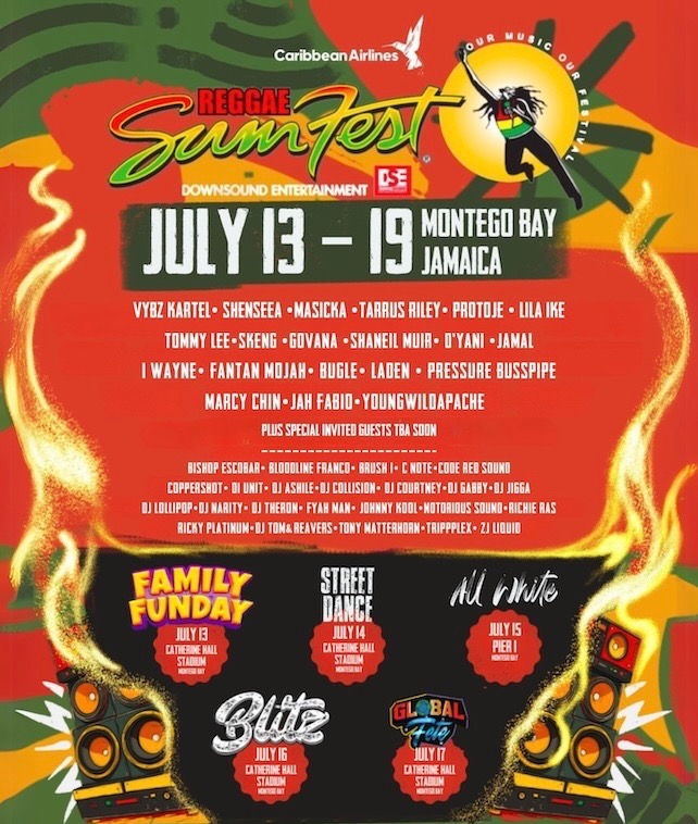 This annual week-long festival begins with the Sumfest Family Fun Day on Sunday July 13, followed by Sumfest Street Dance on Monday the 14th, Sumfest All White Party on the 15th, Sumfest Blitz on the 16th, and the Global Fete on the 17th, with main Festival nights on Friday July 18th & Saturday July 19th. The week in its entirety encompasses a true Jamaican Experience of food, dance, music, fashion, culture⦠lifestyle.