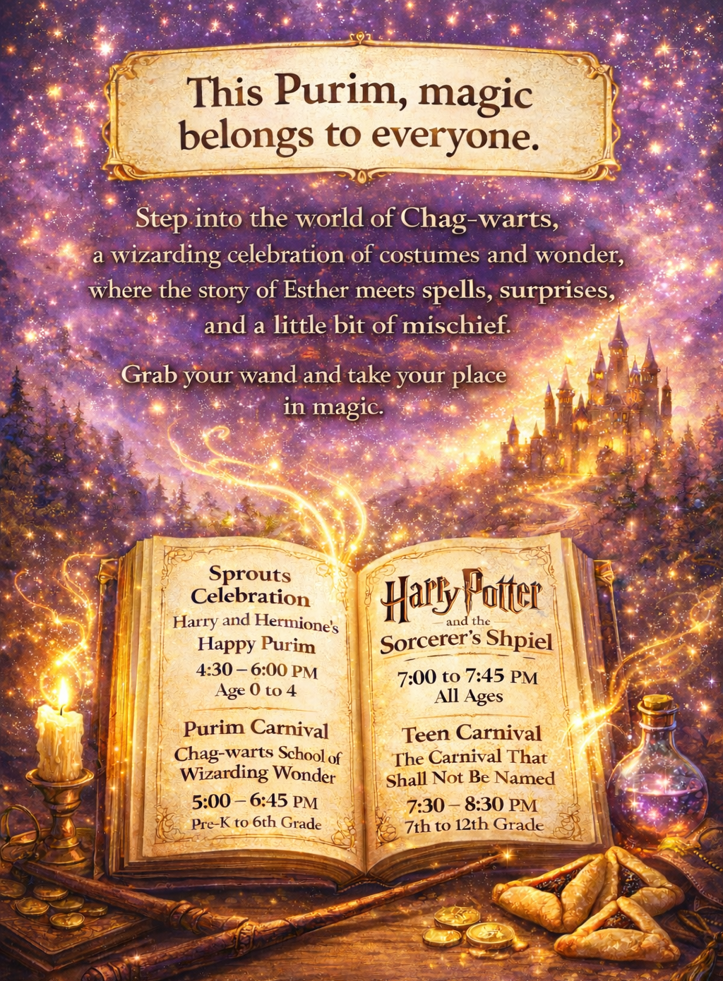 Welcome to Harry and Hermione’s Happy Purim, where the halls of Chag-warts open for a joyful Sholom Sprouts celebration. Together, our youngest wizards and their grown-ups will sing magical songs, try out playful spells, and discover the Purim story in a world of imagination and wonder. Costumes are encouraged as we celebrate Purim with laughter, courage, and a little bit of magic. No prior wizard training required—just imagination, curiosity, and Purim spirit!