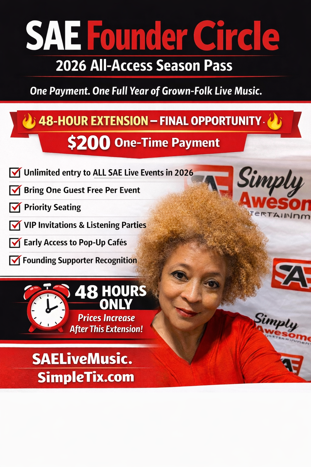 Introducing the SAE Founder Circle – your all-access pass to a year of live music! For just one $200 payment, you get unlimited entry to all our 2026 live music events—and you can bring a guest each time, free. No tickets, no hassle—just show up and enjoy. You’ll also get priority seating, invites to special gatherings, and early access to themed events. Call Ms. L’Tanya at 770-837-7067 if you have any questions!