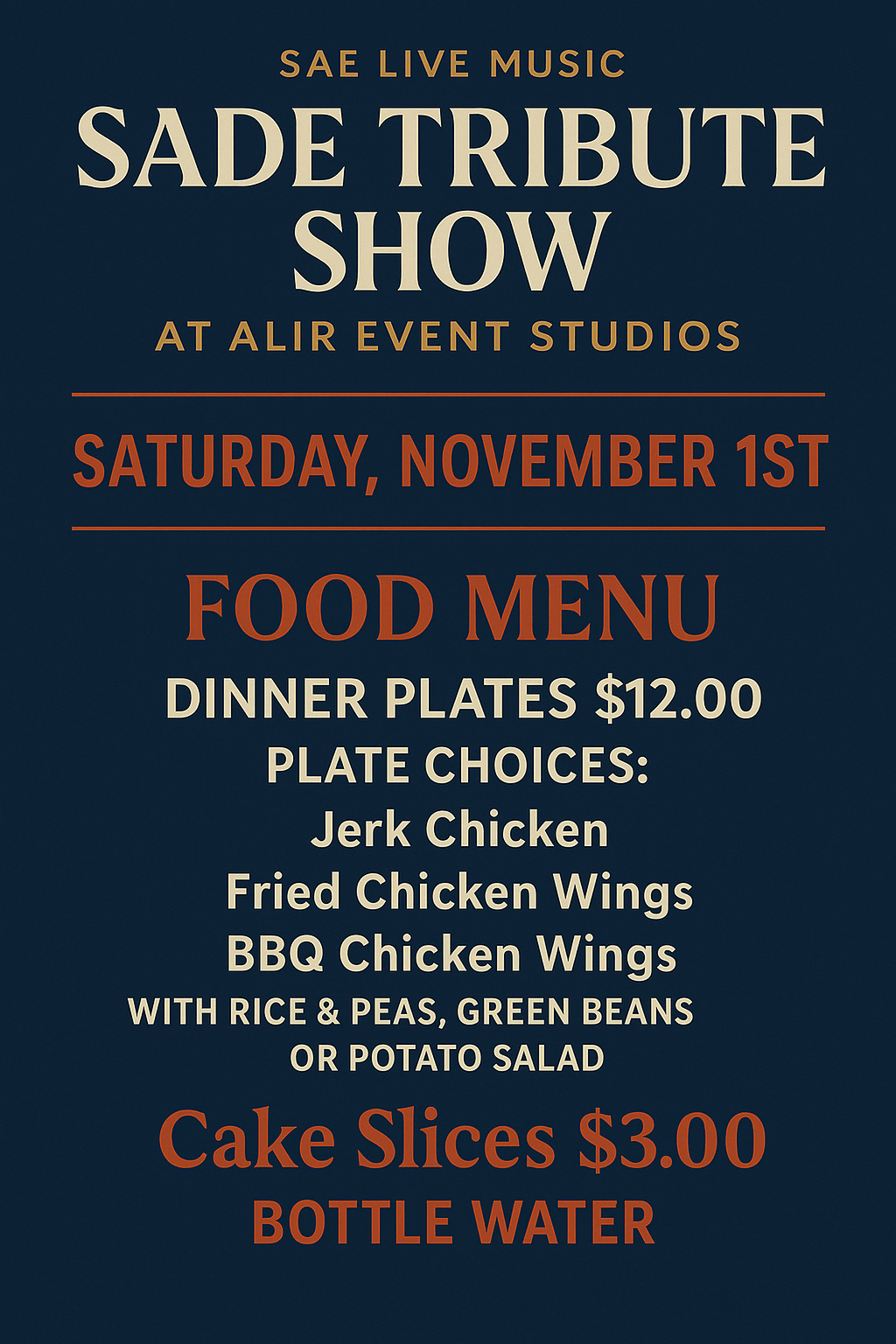 We apologize for the confusion β the Sade Tribute Show β βA Grown & Sexy Nightβ Masquerade Ball Vibes presented by Simply Awesome Entertainment (SAE) Live MusicWILL take place at ALIR Event Studio as originally planned! ππ½β¨