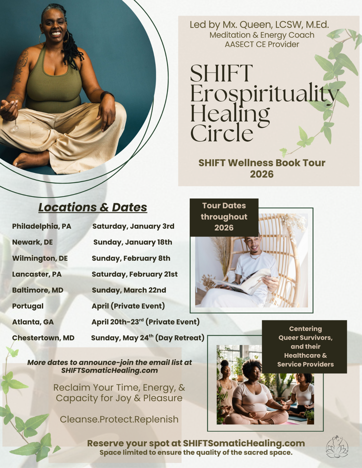 Presented by The Erospirituality Centre, an IRS-designated non-profit, the SHIFT Wellness Book Tour includes the SHIFT Erospirituality Healing Circle & Day Retreat, which offers an embodied, soulful experience led by a subject-matter expert in mental health, integrative wellness, intimacy wellness, and spiritual wellness for a holistic, queer-inclusive experience. The SHIFT Wellness Book Tour centers queer survivors and their healthcare providers navigating life’s ebbs and flows, embodied and relationship disconnection, burnout, and longing for the mental, physical, and emotional space for joy and pleasure.