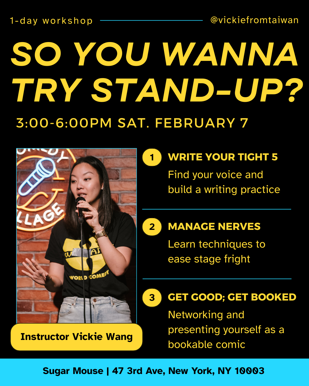 Before moving to New York, Vickie spent nearly a decade in Shanghai writing bilingual copy for Disney, publishing books for LEGO, and performing stand-up under censorship. Her teaching style is practical, supportive, and focused on helping new comics build sustainable habits.
